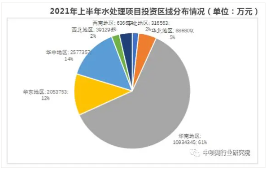 2021年上半年水處理行業項目投資額為1800億元,同比上年同期下降48.7%。今年上半年水處理項目主要集中在華南地區,行業項目投資1093億元。