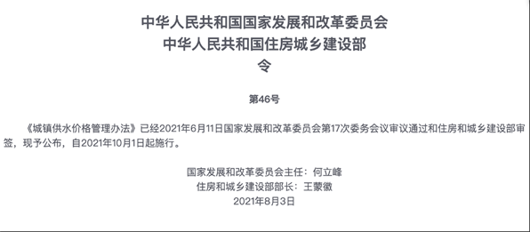 經過一年多的期盼,就在剛剛,國家發改委通過其官網正式對外公布新修訂的《城鎮供水價格管理辦法》