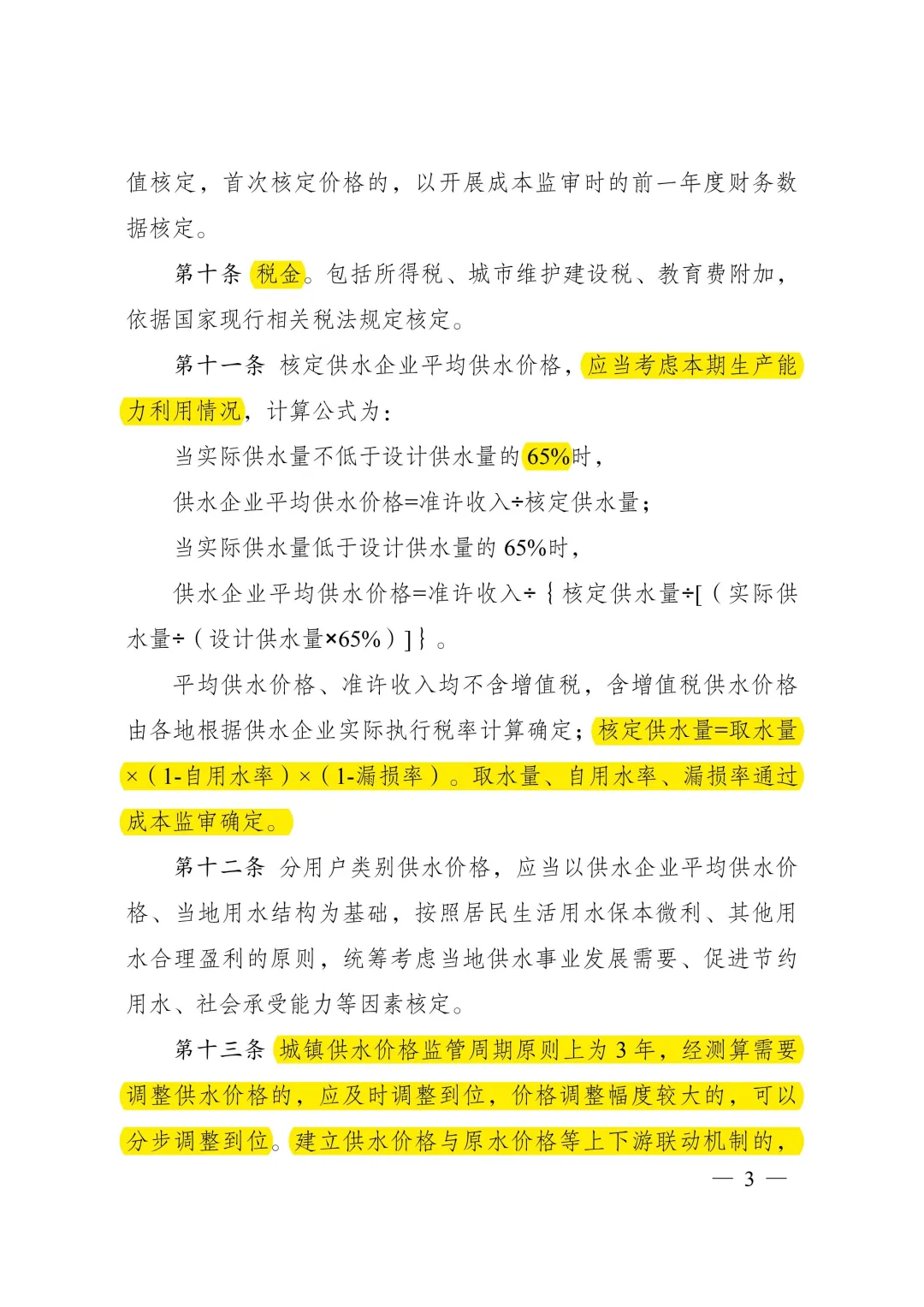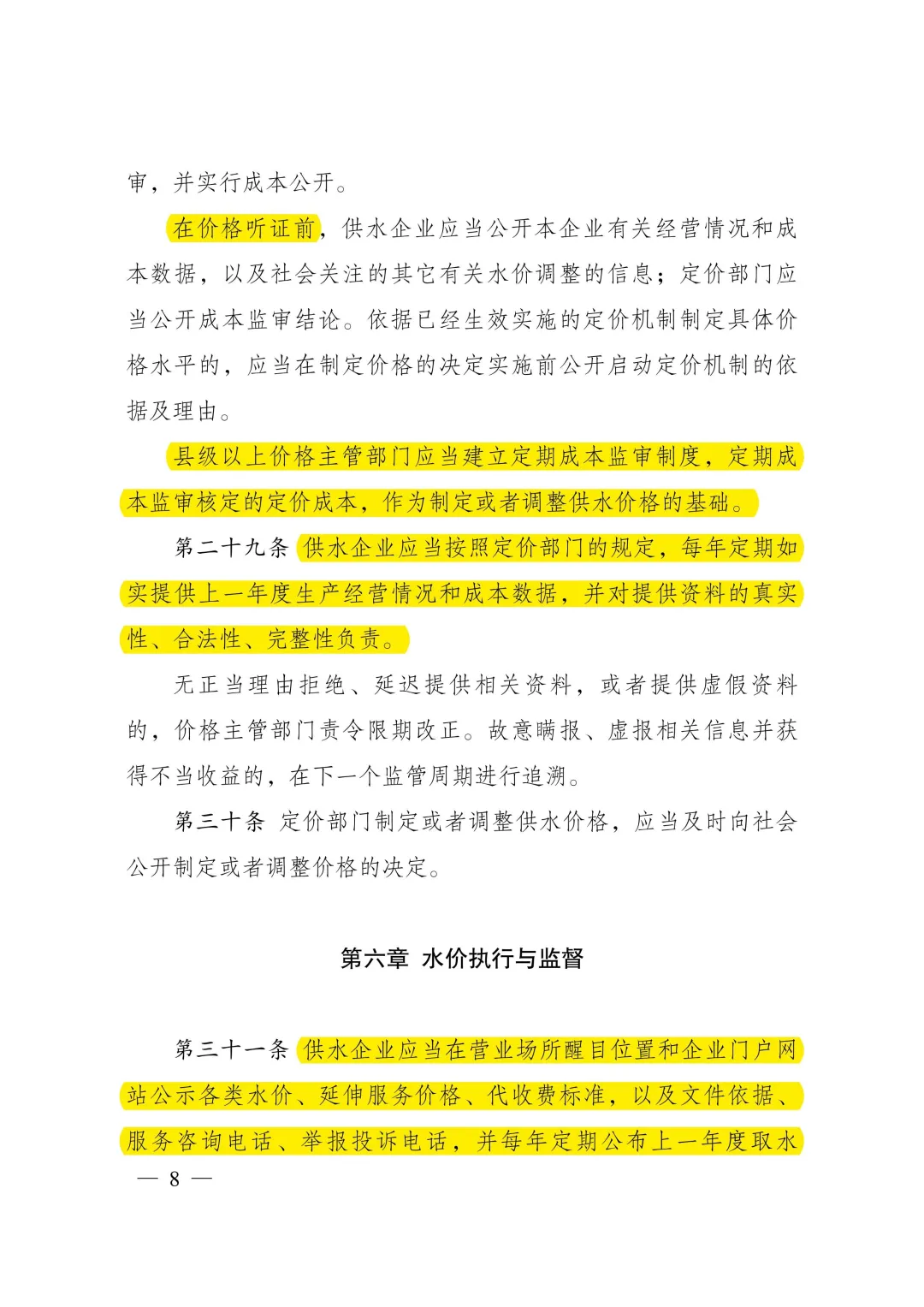 《城鎮供水定價成本監審辦法》明確了定價成本構成和核定方法。主要內容:一是明確城鎮供水定價成本構成范圍。按照合法性、相關性、合理性原則,規定城鎮供水定價成本包括固定資產折舊費、無形資產攤銷和運行維護費,并對計入定價成本的項目作了具體規定。二是明確定價成本和有效資產核定方法。細化明確固定資產折舊、原水費、材料費、動力費、人工費等成本費用的審核標準,對可計提收益的有效資產范圍及其核定方法做出明確規定,對供水企業職工人數定員、管網漏損率控制等建立激勵約束機制。