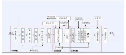 典型的污水廠處理工藝流程是上述方法的組合。以某一級(jí)a標(biāo)準(zhǔn)污水處理廠為例,從進(jìn)水到出水主要分三級(jí)處理區(qū),一級(jí)處理區(qū)主要應(yīng)用物理法(包括攔截、沉淀、除砂等)及一定的化學(xué)法(初沉池前絮凝);二級(jí)處理區(qū)是污水處理工藝核心,主要是以活性污泥為主的生化反應(yīng)(酶促反應(yīng));三級(jí)處理區(qū)主要應(yīng)用物理化學(xué)法,通過(guò)混凝、過(guò)濾、消毒等工藝手段對(duì)污水進(jìn)行深度處理。落實(shí)到具體處理工程中,各級(jí)各類技術(shù)需針對(duì)不同污染物和污染情況進(jìn)行應(yīng)用和改進(jìn)。