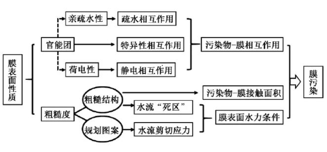 膜表面的親疏水性、荷電性和官能團種類決定了膜與特定污染物之間的疏水作用、靜電作用和特異性相互作用,而表面粗糙度則影響污染物與膜的接觸面積或位點,以及錯流過濾時膜表面的水力條件。決定膜表面粗糙度的形貌特征可分為粗糙結構和規則圖案兩類。