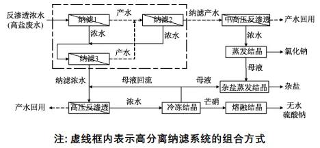 由圖1可知:高鹽廢水首先進(jìn)入高分離納濾系統(tǒng)進(jìn)行分鹽處理,通過納濾對(duì)高鹽廢水中的cl-和so2-4實(shí)現(xiàn)有效分離。然后,納濾系統(tǒng)產(chǎn)水進(jìn)入中/高壓反滲透系統(tǒng)進(jìn)行脫鹽和濃縮處理,反滲透產(chǎn)水進(jìn)行回用,反滲透濃水進(jìn)入蒸發(fā)結(jié)晶系統(tǒng)生成nacl;納濾系統(tǒng)濃水進(jìn)入另一套高壓反滲透系統(tǒng)進(jìn)行脫鹽和濃縮處理,反滲透產(chǎn)水進(jìn)行回用,反滲透濃水進(jìn)入冷凍結(jié)晶系統(tǒng)產(chǎn)出芒硝(naso4·10h2o),芒硝再通過熔融結(jié)晶系統(tǒng)產(chǎn)出無水na2so4。蒸發(fā)結(jié)晶和冷凍結(jié)晶系統(tǒng)的母液進(jìn)入雜鹽蒸發(fā)結(jié)晶系統(tǒng)產(chǎn)出少量雜鹽,同時(shí)一部分冷凍結(jié)晶母液回流至高壓反滲透系統(tǒng)前端,與納濾系統(tǒng)濃水混合后實(shí)現(xiàn)循環(huán)處理。
