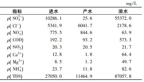 該工程于2018年12月底通水,穩(wěn)定運(yùn)行3個(gè)多月后開始連續(xù)取樣并進(jìn)行水質(zhì)監(jiān)測(cè),監(jiān)測(cè)時(shí)間區(qū)間為2019-03—12,監(jiān)測(cè)期間進(jìn)水水質(zhì)如表2所示。可見:監(jiān)測(cè)期間項(xiàng)目進(jìn)水水質(zhì)波動(dòng)幅度很大,進(jìn)水tds濃度高,且主要組分為na+、so2-4和cl-,進(jìn)水no-3濃度較高;由于前端的中水回用系統(tǒng)設(shè)置了預(yù)處理裝置,所以進(jìn)水硬度較低。