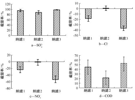 在高分離納濾系統(tǒng)中各納濾子系統(tǒng)的so2-4、cl-、no-3和cod平均截留率如圖3所示。
