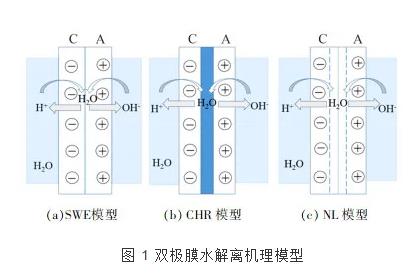 然而雙極膜中發(fā)生的水解離現(xiàn)象不同于通常的水解離,研究者們對其解離的過程機理開展了大量的理論研究,但限于過程的復(fù)雜性,目前還沒有達成統(tǒng)一的結(jié)論。根據(jù)水在雙極膜中間層解離過程的不同,主要提出3種解釋水解離機制的物理模型,見圖 1。