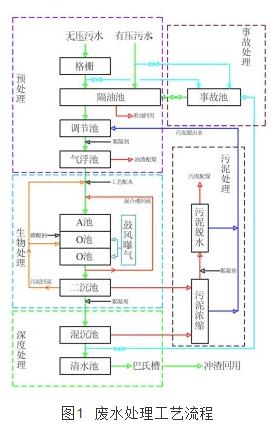 根據酚氰廢水的水質特征,確定采用重力除油+加壓溶氣氣浮+sdn(a/oo+二沉池)+混凝沉淀的核心工藝對其進行處理,工藝流程如圖 1所示。