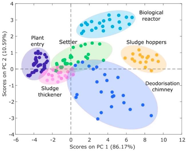 通過pca主成分分析,污水廠可以更直觀地了解不同地點的臭氣源類型:
