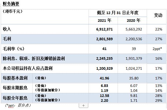 二零二一財政年度,本集團(tuán)經(jīng)營勢頭穩(wěn)健,錄得收入69.1億港元,較二零二零財政年度增長22%;除利息、稅項、折舊及攤銷前盈利22.5億港元,較二零二零財政年度增長16%;本公司權(quán)益持有人應(yīng)占盈利12.0億港元,較二零二零財政年度增長17%;每股基本盈利41.96港仙,較二零二零財政年度增加6.16港仙,增幅17%;整體毛利率為41%,較二零二零財政年度上升2個百分點。本集團(tuán)融資渠道多元暢通,融資工具長短期兼?zhèn)洌Y產(chǎn)質(zhì)優(yōu),資金充裕,負(fù)債合理,財務(wù)狀況健康。